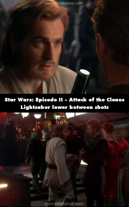 Continuity mistake: When Obi-Wan hands Anakin his lightsaber outside the nightclub, he holds it in front of Anakin's face, but when Anakin grabs it, Obi-Wan is holding it much lower than in the previous shot. (00:21:05)