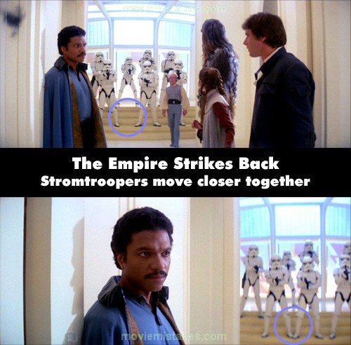 Continuity mistake: When Vader is seen in Cloud City, Lando says, "I had no choice, they arrived right before you did" and two of the stormtroopers on the lowest step are standing about a metre apart. In the following close-up of Lando, they are standing so close together that their ankles are touching. This can only be seen in the widescreen version. (01:25:05)