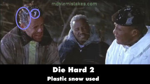 Revealing mistake: Throughout the whole movie, bits of 'snow' stuck to various things in close up view (i.e. guns, hair, faces, clothing). Look closely at the snow, its quite obvious that they are actually little thin scraps of white plastic. Most evident is in McClane's hair when the platoon is about to move in on the church, the shot of him saying "You're not such an asshole, after all." (01:27:55)