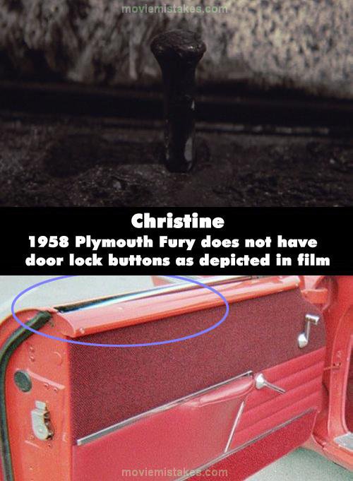 Factual error: There are a few scenes in the movie which show Christine locking her doors and we see that she has common lock "buttons" on the inside door panels. This is incorrect - 1958 Plymouths are not equipped with buttons. To lock the door, the door handle has to be rotated counter-clockwise. (00:48:15)