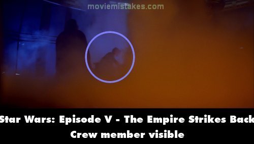 Visible crew/equipment: When Luke and Vader are fighting in the carbon-freezing room, in the wideshot after Luke does a somersault, a crew member is visible in the steam on the right side of Vader, moving out of the way. (01:40:50)