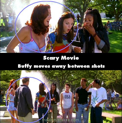 Continuity mistake: When Greg confronts Ray about the picture he found in the locker room, he shows them all and they start laughing. Buffy is on the left part of the screen, (on Cindy's right side), then Cindy explains that she got a note. Then when she says: "Somebody knows.", Buffy is more to the right (or left of the screen) than before. Then when Cindy says they have to call the police, Buffy's back to where she was at first. (00:26:50)