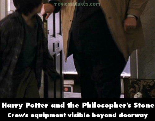 Visible crew/equipment: Petunia and Dudley enter the house when they return from the zoo, followed by Vernon and Harry. The crew's equipment is plainly visible on the ground beyond the doorway. Also, the pavement at the threshold extends far beyond the doorway and just before Vernon walks into the house, Vernon is visibly coming from the side of the doorway. In the earlier exterior shot when they stand by the car before they leave, as Vernon says, "I'm warning you now boy...," not only is the ground at the doorway completely different, there is a garden surrounded by white bricks beside the door, making it impossible for Vernon to have been standing there. (Visible on DVD fullscreen.) (00:05:40 - 00:08:05)