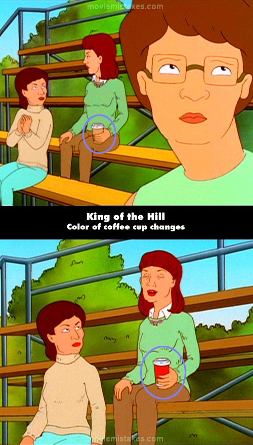 Continuity mistake: Before Peggy leaves the soccer mums and goes to watch football again, the woman in the green sweater is holding a coffee cup that is of a pale brown color. When the shot goes to a close up of her talking, the color is now red. The next time you see her holding the cup, it's gone back to being a pale brown color. (00:18:15)