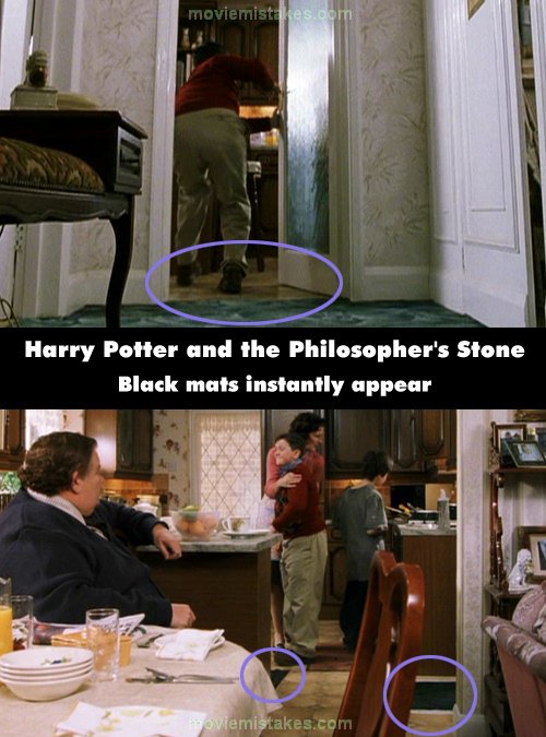 Continuity mistake: After Dudley shouts, "Wake up, Potter! We're going to the zoo," he pushes Harry back into the cupboard and runs into the kitchen. When he opens the door, the kitchen floor is visible and there are no floor mats. Yet, once Harry walks into the kitchen there is a taped black mat on the floor at the door and another black mat at the counter, under the stools that were visible in the previous shot, when Petunia bangs on the cupboard door. (This does not refer to the reddish mat Dudley stands on.) (00:04:35)