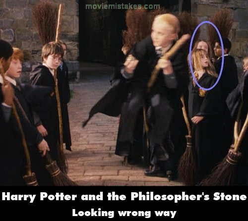 Revealing mistake: After Madame Hooch takes Neville to the hospital wing, Malfoy takes the Remembrall and mounts his broomstick, on a convenient protruding metal rod. Then when he comes around, though the students step away and watch as he begins to fly off, many of their eyes are not level with Malfoy, as he is merely edited into the end of this shot. (00:57:50)