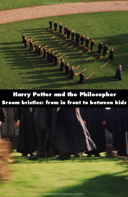 Continuity mistake: In the overhead wide shot, before Madame Hooch says, "Good afternoon, class," as she approaches, each student stands directly behind the bristles of their broomsticks, yet in the next shot as the camera pans their feet, they stand between the bristles of their broom and the neighboring broom. (00:55:00)