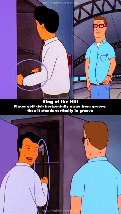 Continuity mistake: As Kahn is putting the golf club away after Hank has just used it there is a groove in the locker to support the club. Kahn seems to place the club horizontally in the locker no where near the groove and to the left of it. The next shot its now sitting in the groove vertically. (00:05:05)