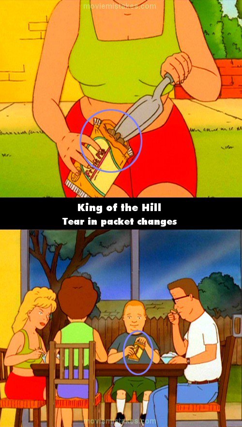 Deliberate mistake: As Luanne is putting the dirt into Bobby's fruit pie you can see she rips open a large part of the packet. Yet in the next scene when Bobby is about to eat the pie there is no sign of where Luanne ripped the packet. Its likely this was deliberate as the joke in the scene was Bobby and Luanne's constant attempts to get back at each other, if they had left the large hole its likely Bobby would have not fallen for Luanne's prank.