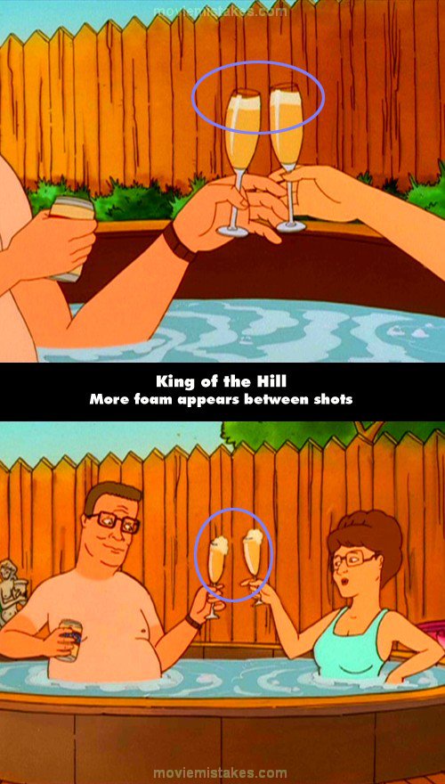 Continuity mistake: During the scene where Peggy and Hank are enjoying a spa, Hank fills up the champagne glasses with beer. He stops pouring a bit before the top of the glasses and there is very little foam on the top. In the very next shot both their glasses have foam overflowing from it.