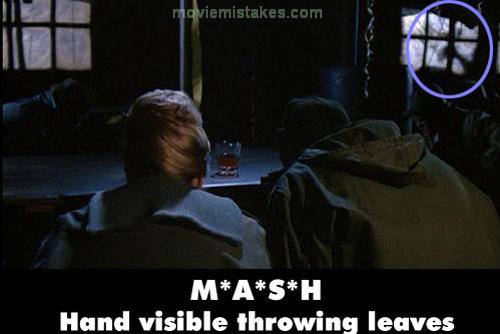 Visible crew/equipment: When Frank and Hot Lips are walking into the mess tent for Frank's surpise party, if you look in the window to the right of the door, you can see a person silhouetted, throwing leaves into the wind.