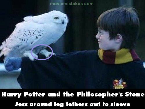 Visible crew/equipment: Dumbledore tells Harry that he will move the Mirror of Erised and not to go looking for it. In the following shot Harry walks outside in the snow with Hedwig on his arm. In the close-up of Hedwig, the jess (strap) around his left leg is visibly tethered to Harry's sleeve. The inside of Harry's sleeve also has a strap that secures the sleeve around Harry's wrist. Hedwig is obviously not tethered in the next shot. (01:36:45)