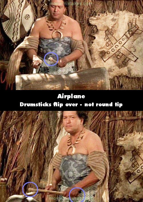 Continuity mistake: After you see all the newspapers talking about the plane, and when you see the drummer on TV who speaks by drum tones, when the drums are handed to him the ends of the sticks are round, but when he looks to HIS left, after the camera changes position, they're not round anymore. (01:04:45)