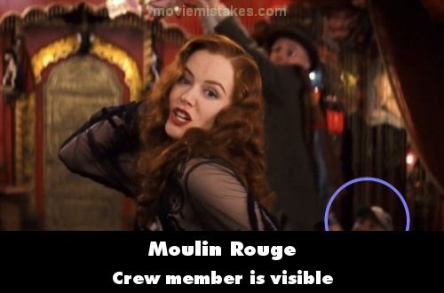 Visible crew/equipment: During the The Pitch, a crew member is visible after they sing "elephant, Bohemians, Indians, and courtesans...". He can be seen wearing a green/gray baseball cap, pushing the bald man who is hanging on the chandelier.