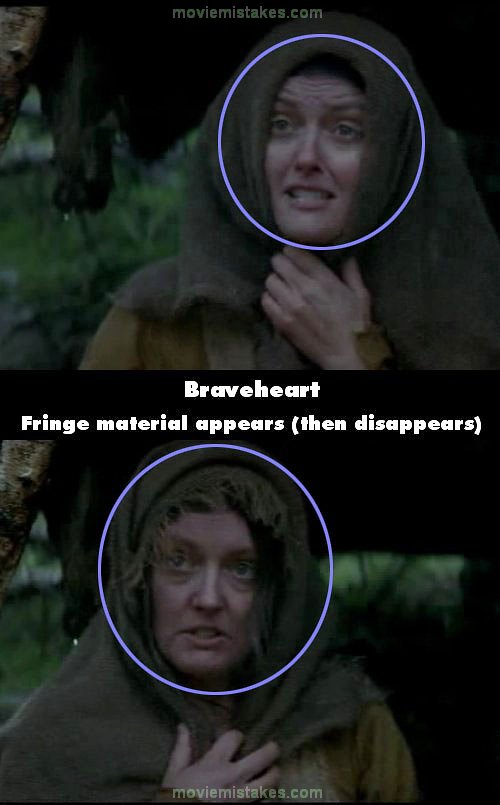 Continuity mistake: When Wallace arrives at the home of Murron to invite her for a ride in the rain, the mother's head covering changes several times between shots. Sometimes it has the yellow fringe close to her face and other times it does not have the fringe at all. (00:29:40)