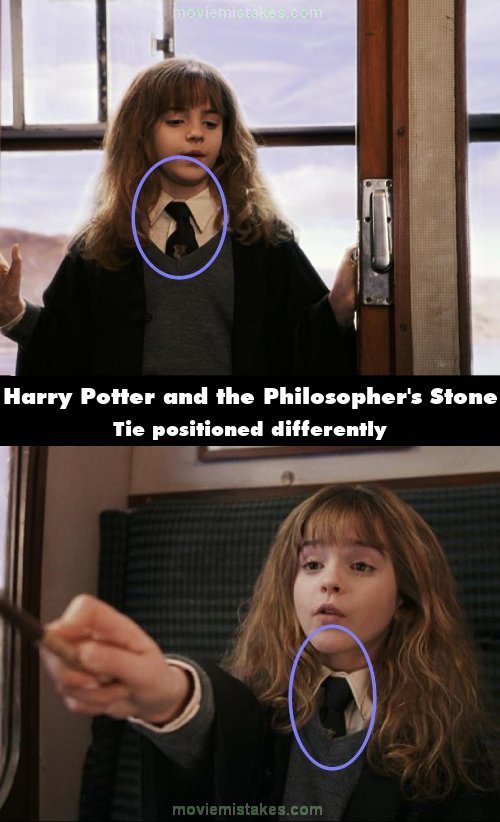 Continuity mistake: On the Hogwarts Express, Hermione first watches as Ron tries to turn Scabbers yellow, she then joins them inside before she actually leaves and in these consecutive shots, her tie differs. (00:36:30)
