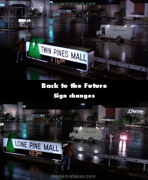 Trivia: When Marty first goes back in time the mall is called "Twin Pines Mall". In 1955 he runs over one of 'old man' Peabody's pine trees. On his return to 1985 the mall is now called "Lone Pine Mall". (01:39:10)