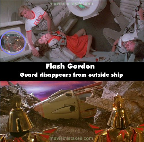 Continuity mistake: When Flash, Dale and Zarkov first land on Mongo, the shots from inside the ship show Ming's guards walking right up to the ship's window and looking inside. When it then cuts to an outside shot, the guards are much further away.