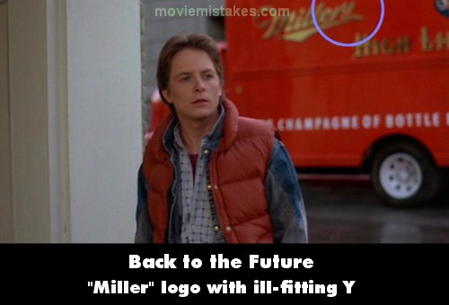 Trivia: When Marty first arrives in 1955, right when Mr. Sandman starts playing, you can see a truck directly behind him. If you look closely you can see that the logo on the truck looks like a Miller Beer logo. That's because it *is* a Miller Beer logo. The "Y" is actually a stylized twirl off the "R." (00:33:55)