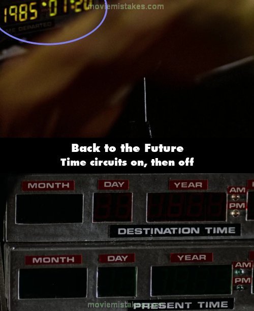 Continuity mistake: When Marty is trying to escape from the van he turns the time circuits on. However, the time circuits were already on - you can see them illuminated when he first puts the car in gear. (00:28:45)