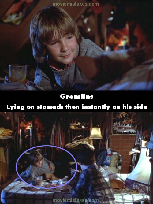 Continuity mistake: When Pete is laying on Billy's bed talking to Gizmo, in one shot he's laying on his stomach, then in the next shot he's laying on his side. (00:23:55)