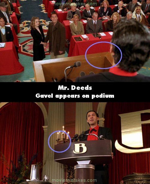 Continuity mistake: When Emilio finds out he is the rightful heir to $40 billion, he is standing at a wooden lectern, and he says to Deeds "And you, Long-Long-Longfellow..." and there is a shot of Emilio from behind, and there is nothing resting on the lectern, yet in the following wideshot, a gavel is laying on the lectern. (01:24:35)