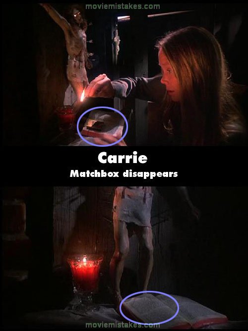 Continuity mistake: When Carrie's mother locks Carrie in the closet, Carrie takes a box of matches, lights the match, then lights a candle and places the matchbox down on a Bible. In the next shot the matchbox is gone. (00:15:40)