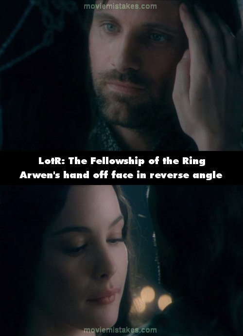 Continuity mistake: When Arwen and Aragorn are talking on the bridge, she caresses his cheek and forehead. In the next shot, her hand is no longer on his face.