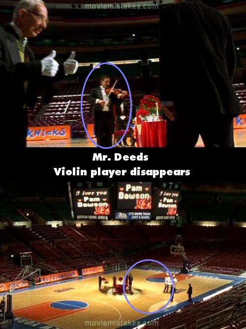 Continuity mistake: When Deeds enters the basketball stadium, in a closeup there is a man playing a violin. In the following wide shot though, he disappears, but he returns in the next shot, when Deeds walks past the old man, the two chefs, he then walks past the violin player. (01:04:25)