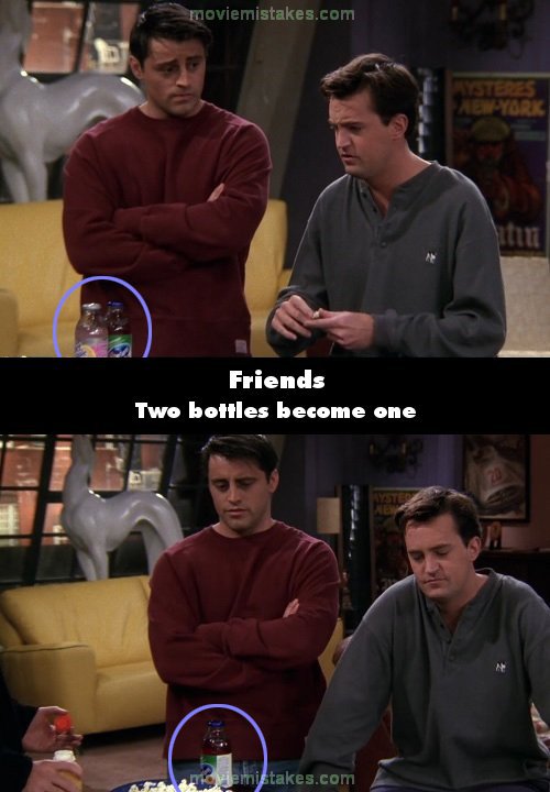Continuity mistake: When Joey is asking Ross why he told Emily that he loves her, Joey's bottle of juice is right in front of him. In the next shot of Joey, there's two bottles - Monica's Diet Snapple and Joey's juice, and in the next shot it's back to one again. Monica's drink appears and disappears throughout the scene. (00:11:25)