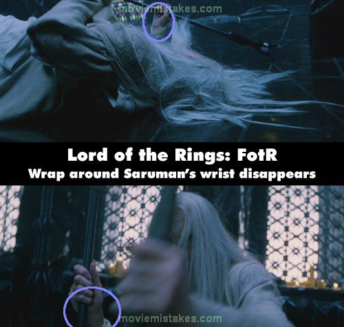 Continuity mistake: When Saruman and Gandalf start to battle at Orthanc, the first time Gandalf points his staff, he causes Saruman to slam onto his back. In the close-up of Saruman, the white wrap around the palm of his hand and wrist is perfectly visible on his right hand. He does not wear the wrap on his hand in the previous and most of the following shots. (00:50:25)