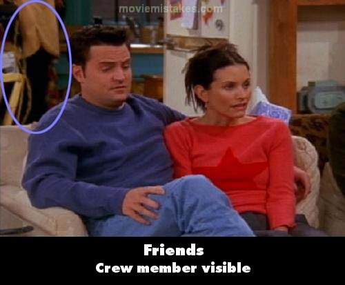 Visible crew/equipment: After Jill comes to Monica's apartment, they are all around the table in the living room. As the camera is moving from Jill, to Monica and Chandler, who are sitting on the couch, a camera-man is visible in the kitchen behind them, complete with camera and trailing wires. (00:04:15)