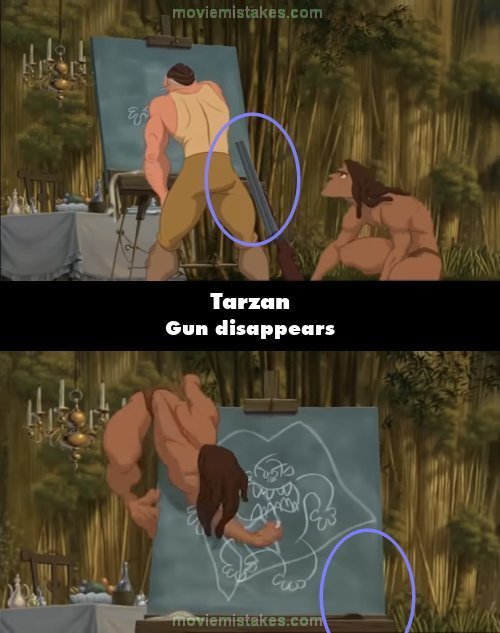Continuity mistake: When Clayton is drawing on the chalkboard his shotgun is leaning against it. After Tarzan takes the chalk and draws all over the chalkboard, the gun has disappeared.
