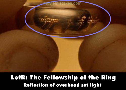 Visible crew/equipment: After Gandalf removes the One Ring from the fire and places it in Frodo's hand. The large overhead set light is reflected in the Ring, above Frodo's reflection, as he turns it between his fingers in the second close-up of the Ring. (00:37:20)