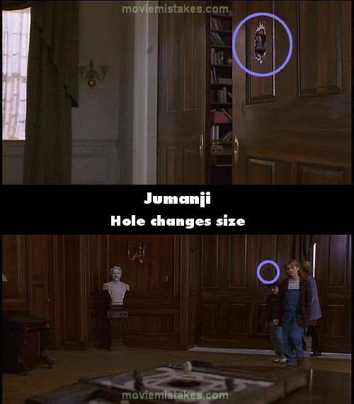 Continuity mistake: When Van Pelt comes out of Jumanji, he starts shooting at Alan. Alan then runs through the brown doors, and Van Pelt shoots, misses, and blows a large hole into the door. Yet when they all return to the room, the hole in the door is smaller. (00:53:20 - 00:55:25)