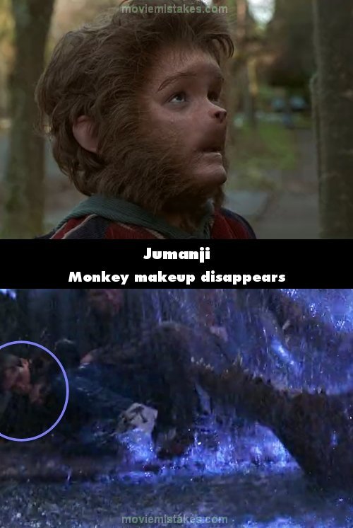 Revealing mistake: During the monsoon scene, everyone is on a table trying to climb on the chandelier. Peter has been turned into a monkey, and his face is covered in hair and has the characterists of a monkeys face, yet in shots when they are on the table, like when the crocodile snaps at them on the table, just before Alan lifts Peter onto the chandelier, you can see the plain face of his stunt double, with no monkey features! Robin William's and Bonnie Hunt's doubles are rather obvious in these same shots too. (01:17:20)