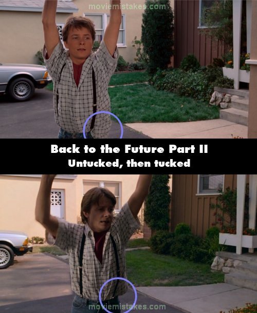 Continuity mistake: At the beginning, when Marty is examining his truck in the garage, the left side of his shirt is tucked-in in the front, but in the first film, Marty's left shirt tail was hanging out. (00:00:36)