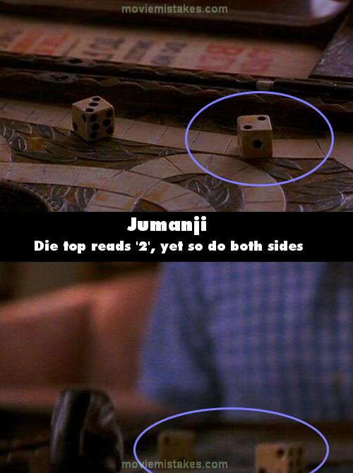 Continuity mistake: When Alan drops the dice, after being startled by the clock chimimng, one die reads 3, the other 2. Yet when his board piece starts to move, you can see both of the sides of the dice, both reading 2. (00:13:25)
