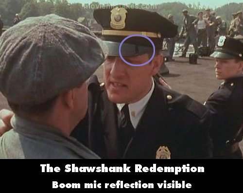 Visible crew/equipment: When Sgt. Hadley nearly throws Andy off the plate factory roof, the reflection of a boom mike is briefly visible in the shiny brim of Hadley's hat. Andy dropped the tar mop before approaching Hadley, and there are no other objects in this shot that could have caused the reflection. (00:35:00)