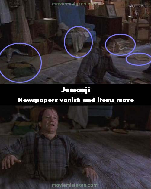 Continuity mistake: During the scene when Alan is trapped in the quicksand, and the others are giving him items to hold onto, you can see behind him, to the viewers right of the blue chair in the background, a small stack of newspapers. But in later shots, such as after Peter runs out of the attic to go to the shed, and we then see Judy crawl over and grab the wooden music stand, to hit the spiders, the stack of newpapers has vanished, and a few other items change position, like the tennis racket. (01:20:55 - 01:23:00)