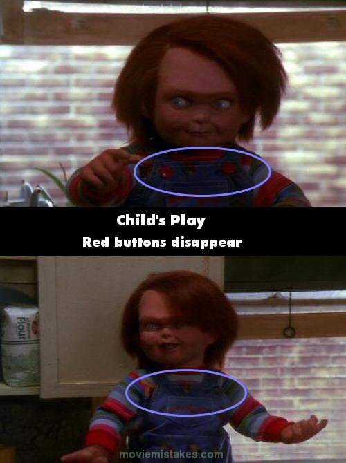 Continuity mistake: When Chucky talks to John, as he stands on the counter, sometimes there are two red buttons on the top of his dungarees, sometimes there isn't. They appear/disappear throughout the scene. (00:59:25 - 01:00:25)