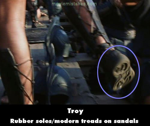 Revealing mistake: As the vast army of Greeks approach the shores of Troy, there is a close-up of Eudorus' legs as he makes his way to Achilles at the bow of the ship. As he walks, the very thick rubber soles with lovely, intricate, modern treads are perfectly visible on his old fashioned sandals with each step that he takes. Countless times the treads are actually identical on different character's sandal's soles. (00:35:55)
