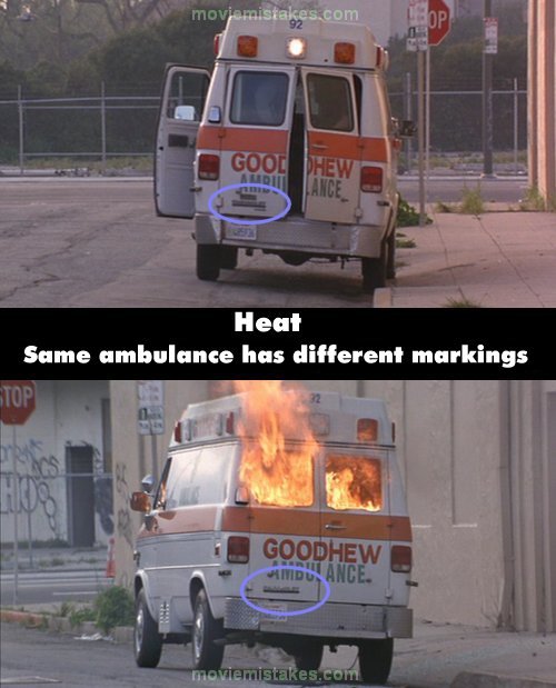 Continuity mistake: When they torch the ambulance, you can see a dealership emblem that says "LEADER" right above the Chevrolet emblem on the back door of the ambulance. It is visible right after Chris puts the bomb in. In all other shots with the ambulance, this emblem isn't there. Obviously the "LEADER" ambulance is a "fake" that they used just to burn and destroy.