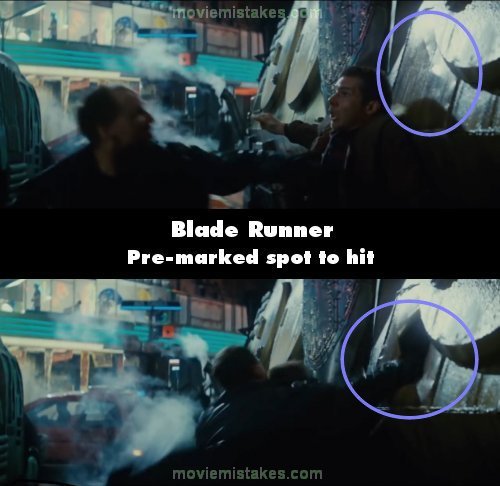 Revealing mistake: When Leon and Deckard are fighting in the street, Leon swings at Deckard and puts a hole through a steel vessel where steam blasts out. It's clear that the spot where Leon hits has been cut out and is visible before he hits it. (01:02:15)