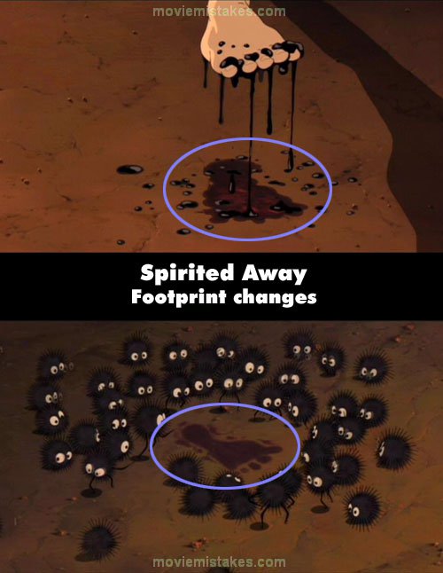 Continuity mistake: When Chihiro stands on the black slug that comes out of Haku, the black stain left on the floor is a distorted mess. However when the sootballs run over to the stain, it is now a perfectly formed footprint. (01:24:00 - 01:25:00)