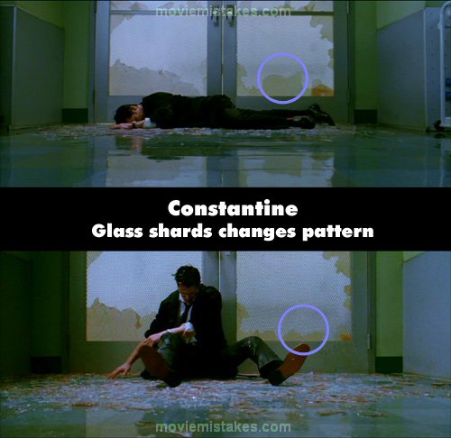 Continuity mistake: When Constantine gets thrown into the glass paned door at the end just before he slashes his wrists, every time it cuts to the scene showing the door the broken glass left in the door is always in a different pattern. (01:32:55)