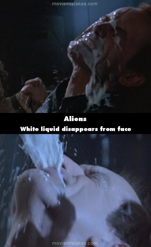 Continuity mistake: When Bishop is impaled by the Queen alien he spews android fluid/juice all over his chin. In a subsequent shot his chin is clean and he is spewing fluid again. The following shot his chin is once again covered. (02:23:30)