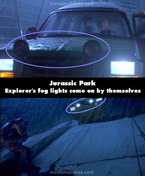 Continuity mistake: When the T-rex breaks out, on the first car, the one with the kids in it, only the regular headlights are on. When it goes over the "cliff" all the headlights are on. (01:03:20 - 01:09:10)