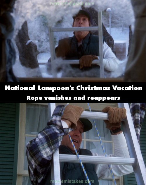 Continuity mistake: When Clarke is installing the Christmas lights, the rope on the ladder keeps appearing and disappearing. (00:23:00)