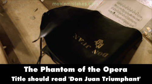 Deliberate mistake: When the Phantom throws his score for 'Don Juan Triumphant' down the stairs, the portfolio only reads 'Don Juan.' (01:23:20)
